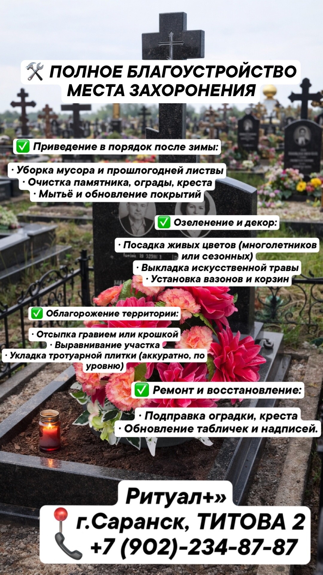 Ритуальное агентство Ритуал+ на улице Титова, 2 предлагает полный спектр похоронно-ритуальных услуг. Квалифицированные специалисты компании предоставят консультацию по всем возникшим у вас вопросам - от оформления документов до организации поминальной трапезы и благоустройства захоронений, окажут помощь в их решении.